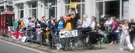 A very hot and stick day. About forty suppressives (including visitors from Manchester, Birmingham, York, Ireland and Germany) turned up outside the Queen Victoria Street "Ideal Morgue". There seemed to be some kind of function going on because about fifteen people went into the empty echoing building (about half dressed in the black trousers, white shirt, red tie uniform). An advertising truck advising "Google Lisa McPherson"went past repeatedly, and at one stage was parked outside, and a car with anti-cult slogans was there later.