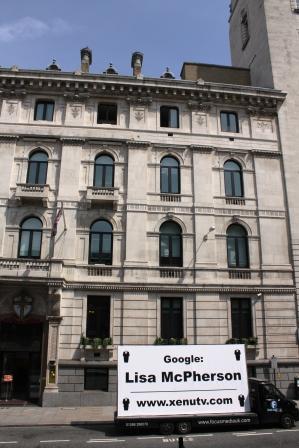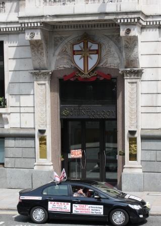 A very hot and stick day. About forty suppressives (including visitors from Manchester, Birmingham, York, Ireland and Germany) turned up outside the Queen Victoria Street "Ideal Morgue". There seemed to be some kind of function going on because about fifteen people went into the empty echoing building (about half dressed in the black trousers, white shirt, red tie uniform). An advertising truck advising "Google Lisa McPherson"went past repeatedly, and at one stage was parked outside, and a car with anti-cult slogans was there later.