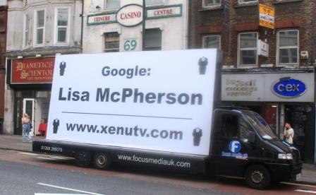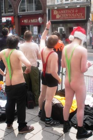 Eventually the protest moved on to the Tottenham Court Road bookshop, where they just had one unhappy clam handing out flyers advertising Queen Victoria Street. Our numbers swelled to about eighty, including three mankini-wearers. It doesn't matter how hot it gets; nothing justifies mankinis.The advertising truck parked outside the bookshop for some time.