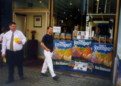 A Bank Holiday weekend, so only a four-person picket. Eventually Jacques Vollet of Scientology's OSA