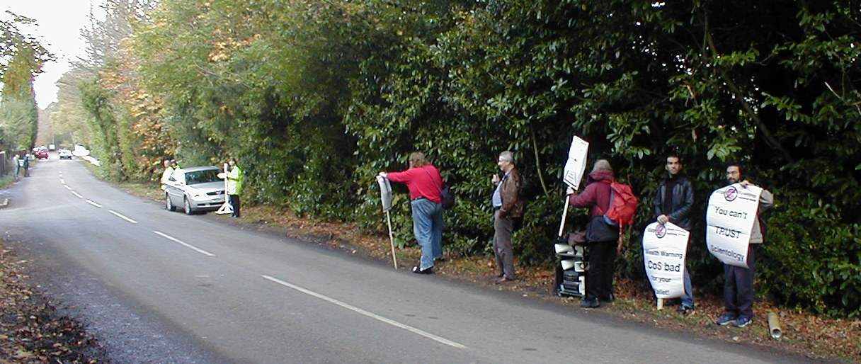 Placards saying ' You are now entering a cult recruitment zone' were also
